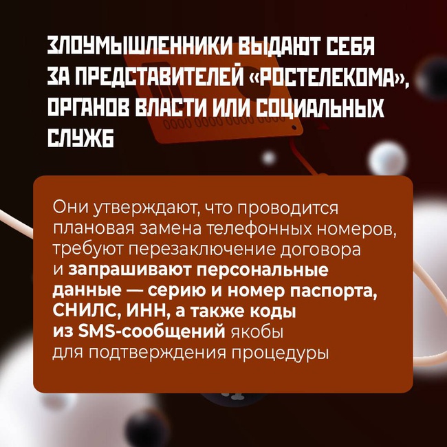 Злоумышленники выдают себя за представителей «Ростелекома», органов власти или социальных служб. Они утверждают, что проводится плановая замена телефонных номеров, требуют перезаключение договора и запрашивают ваши персональные данные.
