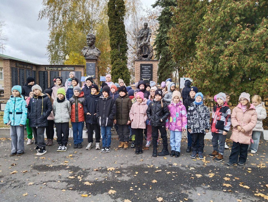 В завершение встречи дети склонили головы у мемориала павшим воинам, где им открылась героическая судьба полного кавалера Ордена Славы, Чуева Гавриила Васильевича, чей бронзовый бюст с достоинством смотрит на посетителей с территории мемориального комплекса.
